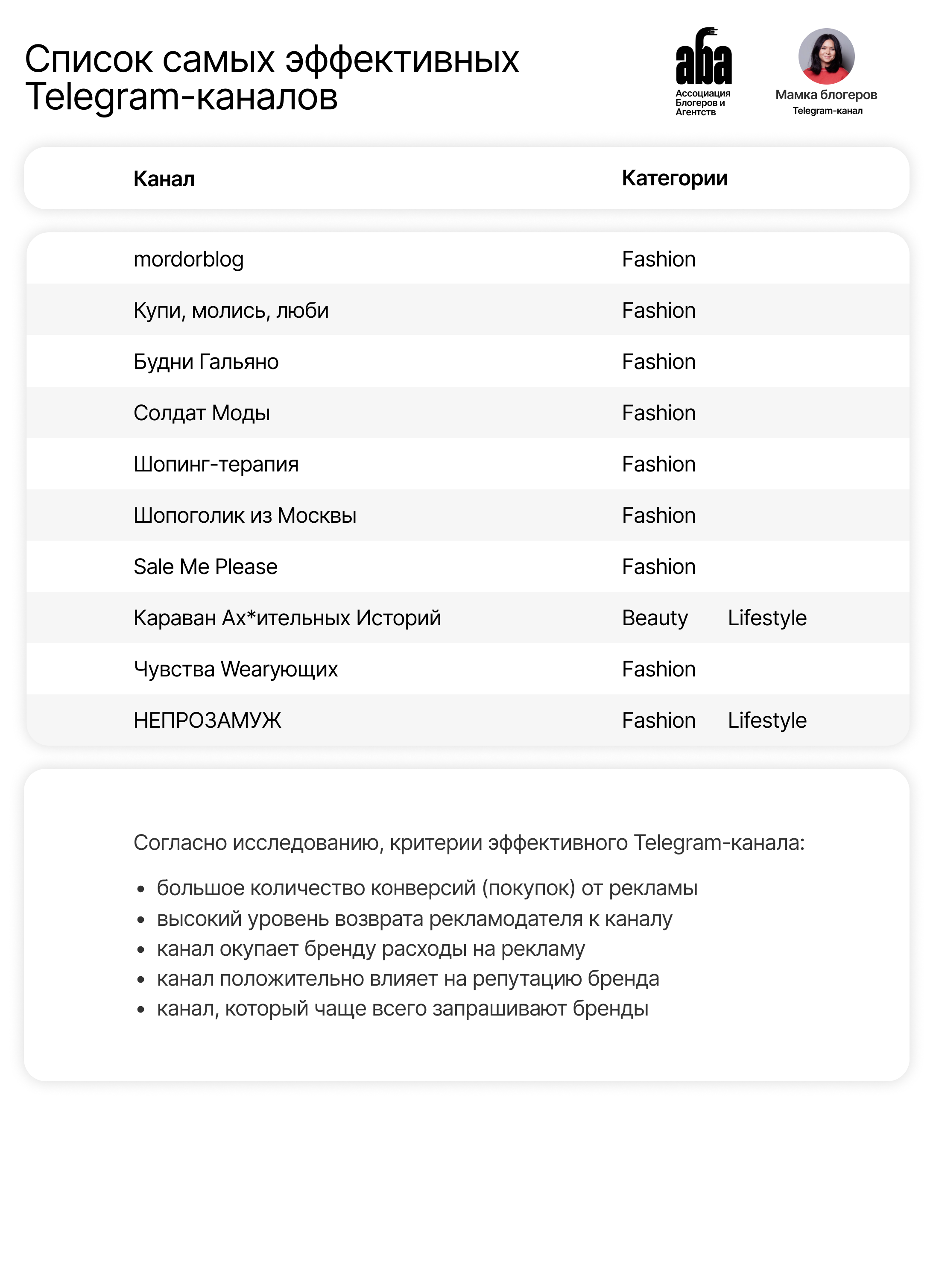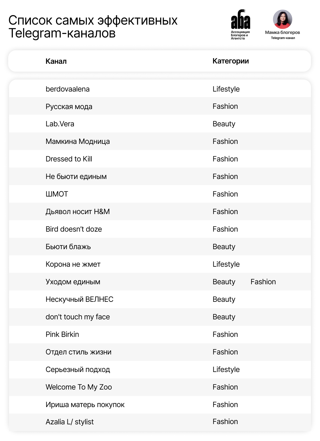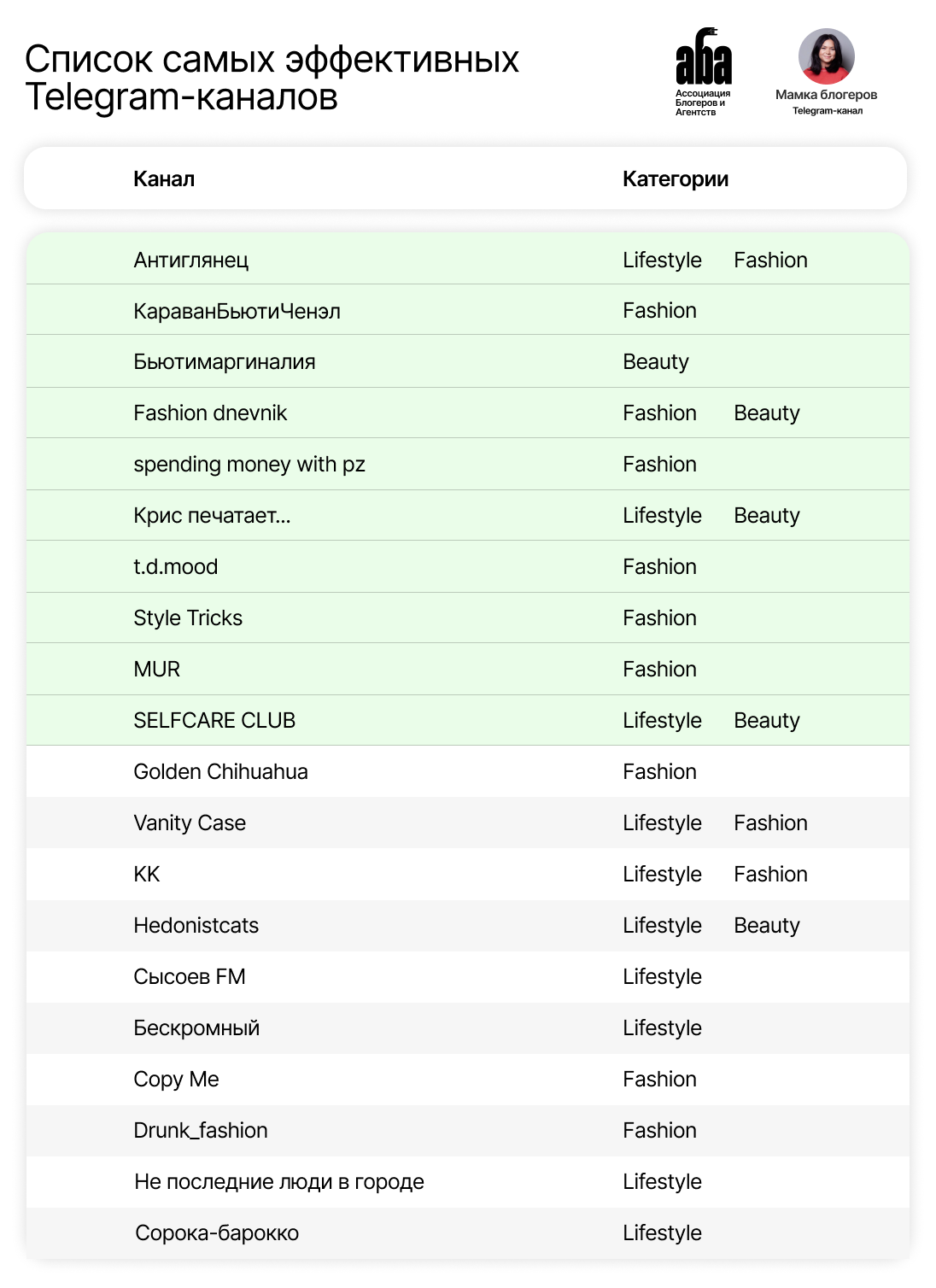 Ассоциация Блогеров и Агентств (АБА) совместно с Евгенией Полищук, – автором «Мамки блогеров», – представили списки эффективных каналов в Telegram в сегментах Lifestyle, Fashion и Beauty.