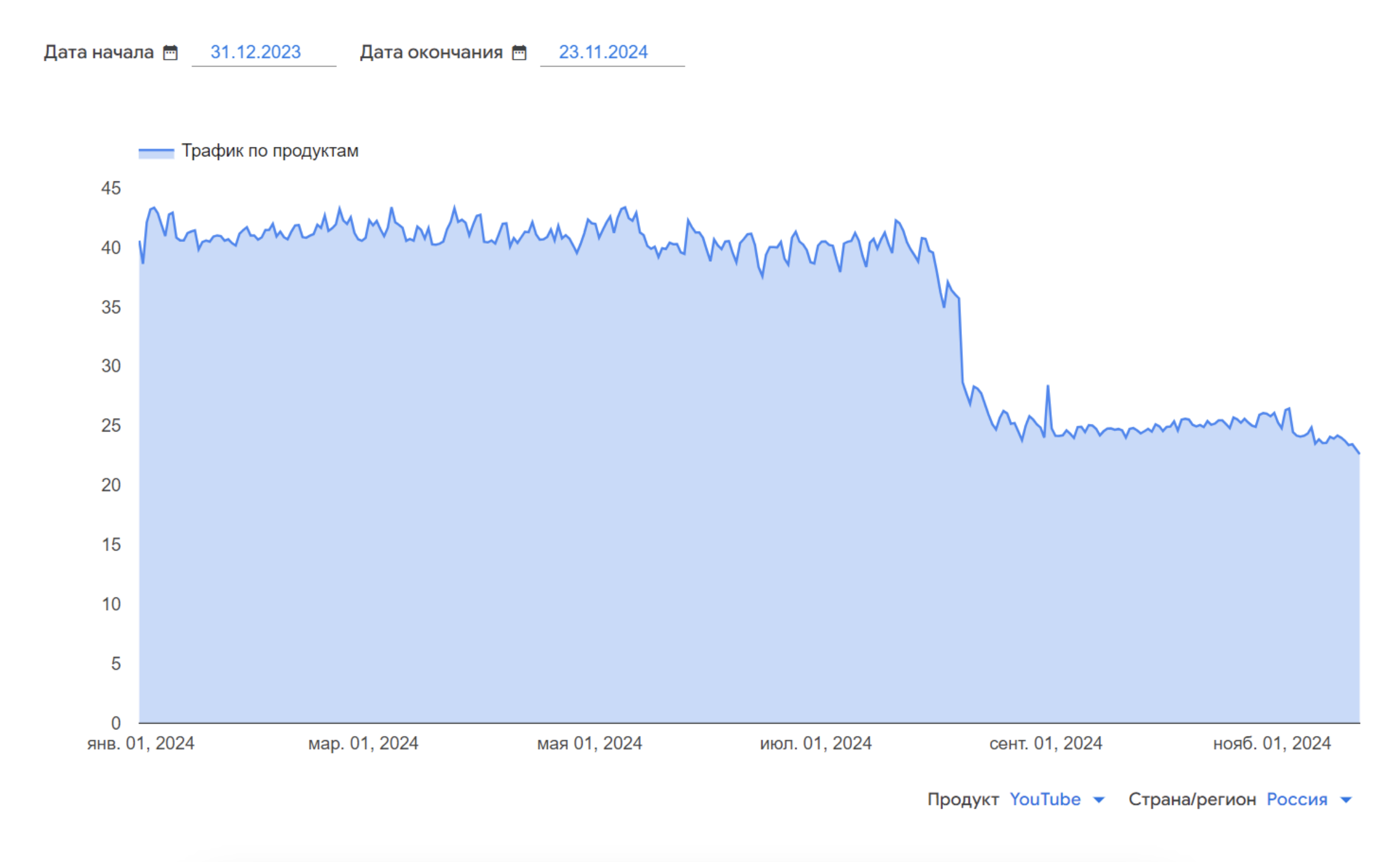 Согласно данным трафика продуктов Google, график трафика Youtube в России с 31.12.2020 по 23.11.2024 выглядит следующим образом: