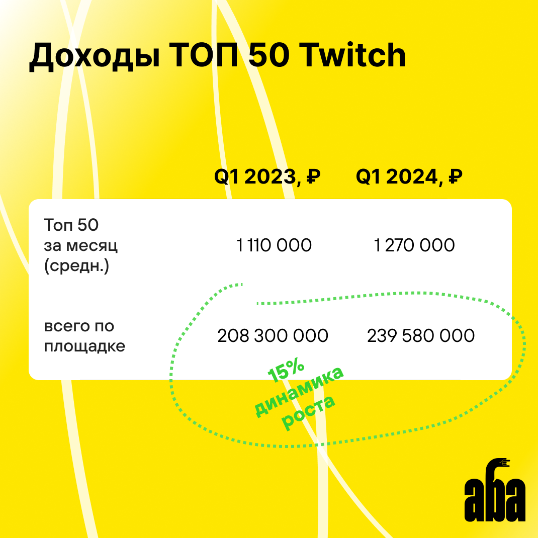 По данным АБА, за 2023 год рынок рекламы на Twitch в русскоязычном сегменте оценивается чуть более, чем в 1 млрд рублей в год, из которых около 80% приходится на Топ-50 самых крупных стримеров. Среднемесячный доход 50 крупнейших блогеров в 2023 году составил чуть более 1,3 млн рублей.
